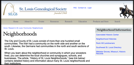 In our blog from 24 May 2021, we wrote about an area of our StLGS website that had helped one of our members break through a genealogical brick wall. This week, we’d like to showcase another set of records on our website that might be helpful to those of you with St. Louis ancestors, our “Neighborhoods” section.